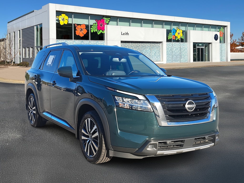 Obsidian Green Pearl 2022 Nissan Pathfinder Platinum 4WD 9-Speed Automatic V6 Local Trade, Non-Smoker, 4WD, 3rd row seats: bench, Bose Premium Audio System, Brake assist, Cargo Area Protector, Cargo Package, Electronic Stability Control, Exterior Parking Camera Rear, First Aid Kit, Front dual zone A/C, Heads-Up Display, Heated front seats, Heated rear seats, Memory seat, Navigation system: NissanConnect Navigation, NissanConnect w/Navigation & Services, Platinum Bench Seat Package, Power driver seat, Power Liftgate, Power moonroof, Power passenger seat, Radio: AM/FM Audio System, Rain sensing wipers, Rear air conditioning, Rear window wiper, Reclining 3rd row seat, Remote keyless entry, Semi-Aniline Leather Seating Surfaces, Split folding rear seat, Steering wheel memory, Ventilated front seats, Wheels: 20" Alloy w/Unique Finish.
