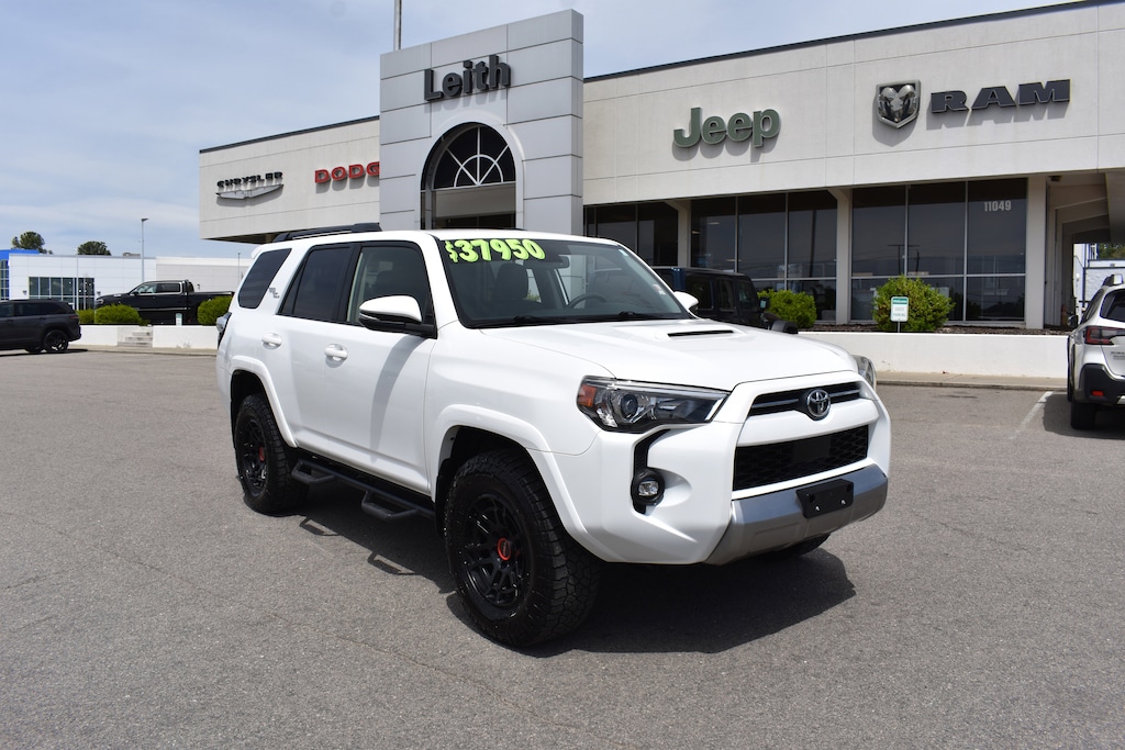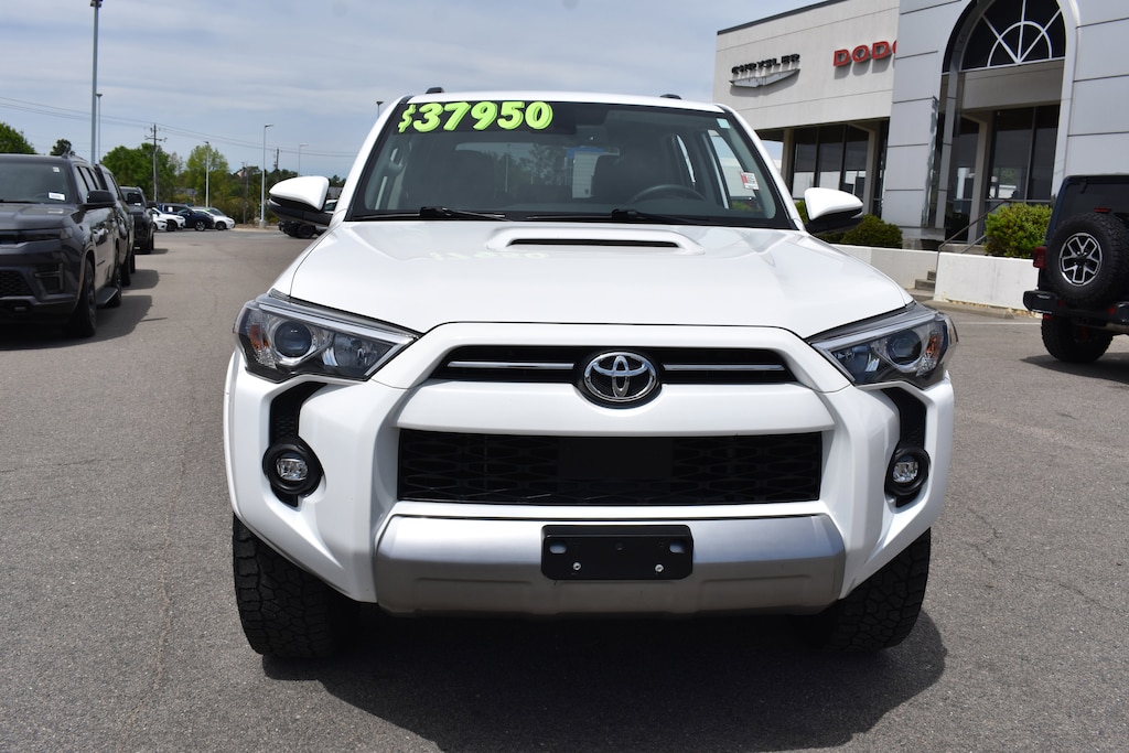 Clean CARFAX. White 2022 Toyota 4Runner TRD Off-Road Premium 4WD 5-Speed with ECT 4.0L V6 DOHC 24V 3.727 Axle Ratio, 4-Wheel Disc Brakes, 8 Speakers, ABS brakes, Air Conditioning, Alloy wheels, AM/FM radio: SiriusXM, Anti-whiplash front head restraints, Apple CarPlay/Android Auto, Auto High-beam Headlights, Auto-dimming Rear-View mirror, Black Roof Rails, Blind Spot Monitor (BSM), Brake assist, Bumpers: body-color, Compass, Dual front impact airbags, Dual front side impact airbags, Electronic Stability Control, Emergency communication system: Safety Connect with 1-year trial, Exterior Parking Camera Rear, Front anti-roll bar, Front fog lights, Front wheel independent suspension, Garage Door Opener, Garage door transmitter: HomeLink, Heated door mirrors, Heated Front Bucket Seats, Heated front seats, Illuminated entry, Knee airbag, Leather Shift Knob, Low tire pressure warning, Occupant sensing airbag, Outside Rear View Mirror, Outside temperature display, Overhead airbag, Overhead console, Panic alarm, Passenger vanity mirror, Power door mirrors, Power driver seat, Power passenger seat, Power steering, Power windows, Radio: Premium Audio w/Dynamic Navigation, Rear anti-roll bar, Rear seat center armrest, Rear window defroster, Rear window wiper, Remote keyless entry, Roof rack: rails only, Security system, SofTex Seat Trim, Speed control, Speed-sensing steering, Split folding rear seat, Spoiler, Steering wheel mounted audio controls, Tachometer, Telescoping steering wheel, Tilt steering wheel, Traction control, Trip computer, Turn signal indicator mirrors, Variably intermittent wipers, Wheels: 17" Unique 7-Spoke Off-Road Alloy.