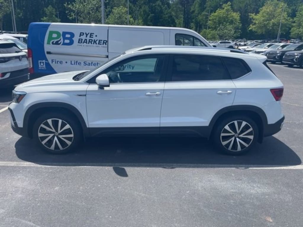 Pure White 2023 Volkswagen Taos 1.5T SE FWD 8-Speed Automatic with Tiptronic 1.5L I4 Turbocharged DOHC 16V LEV3-SULEV30 158hp Auto High-beam Headlights, CloudTex & Cloth Seating Surfaces, Exterior Parking Camera Rear, Fully automatic headlights, Heated door mirrors, Heated Front Comfort Seats, Heated steering wheel, Power door mirrors, Power driver seat, Radio: MIB3 Composition Media AM/FM/HD, Rain sensing wipers, Wheels: 18" 2-Tone Machined Alloy.