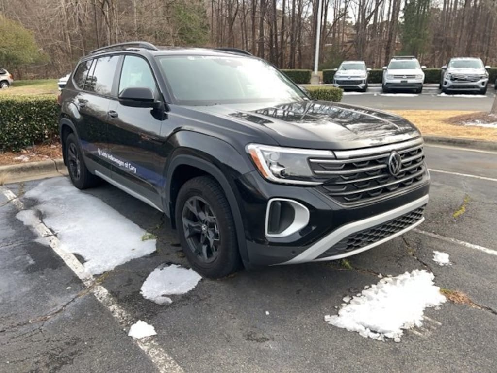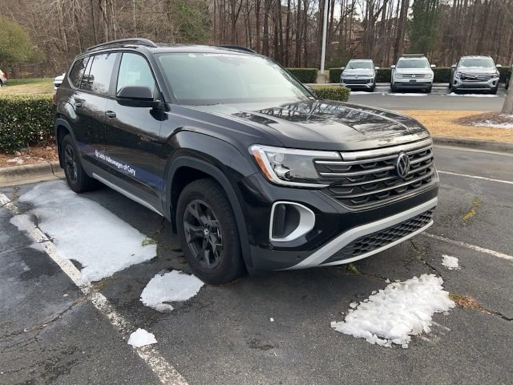 Certified. Deep Black Pearl 2025 Volkswagen Atlas 2.0T Peak Edition AWD 8-Speed Automatic 2.0L TSI